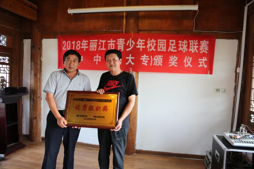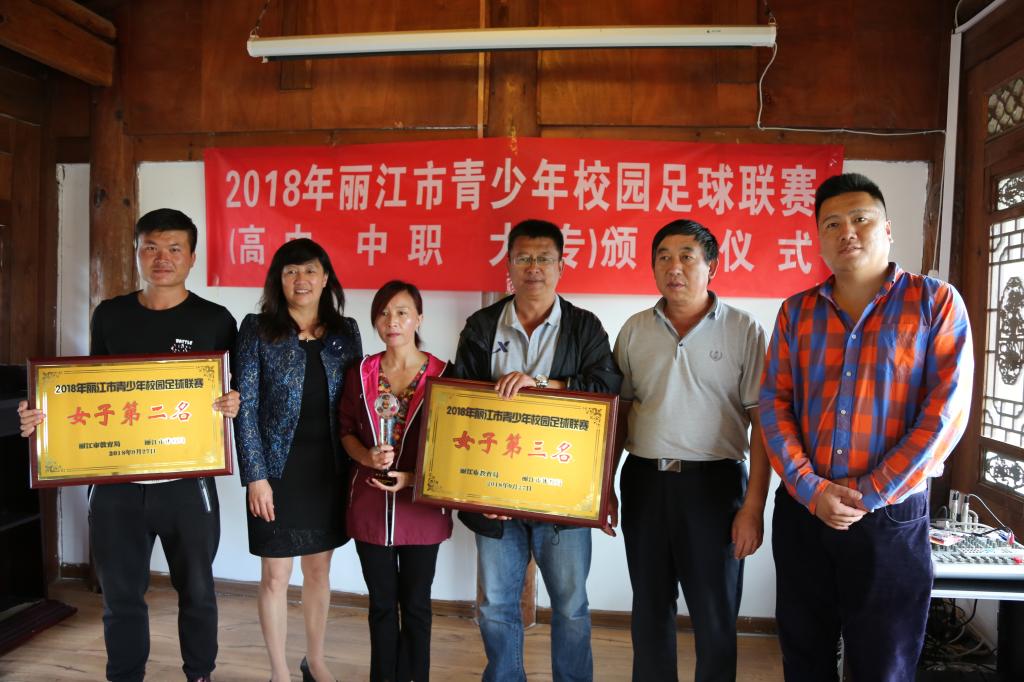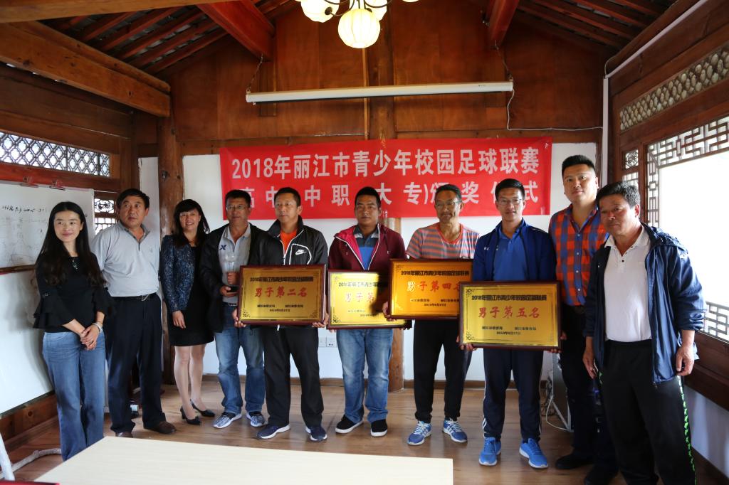 9月27日,2018年丽江市青少年校园足球赛胜利闭幕。丽江市体育局副局长胡建英、丽江市人民政府专职督学冯天祥、丽江市足球协会主席王建民、丽江市教育局体卫艺科副科长王菊喜、校企合作单位—丽江太和集团董事长和昊乾、我校党委委员、足球运动职业学院院长王曙、公共体育教学部主任刘继忠、学生处处长沈欢等领导出席闭幕式,并给比赛获奖者颁发奖杯、奖状。
